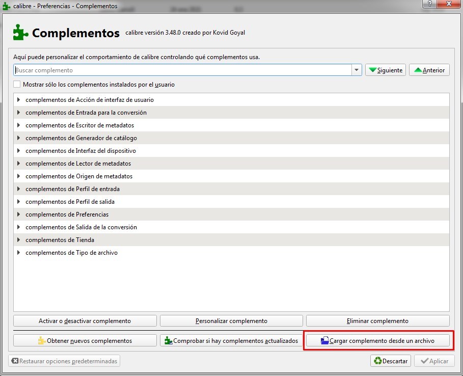 6. Haz clic en «Cargar complemento desde archivo» y selecciona el archivo ZIP que ha quedado en la carpeta tras descomprimir.